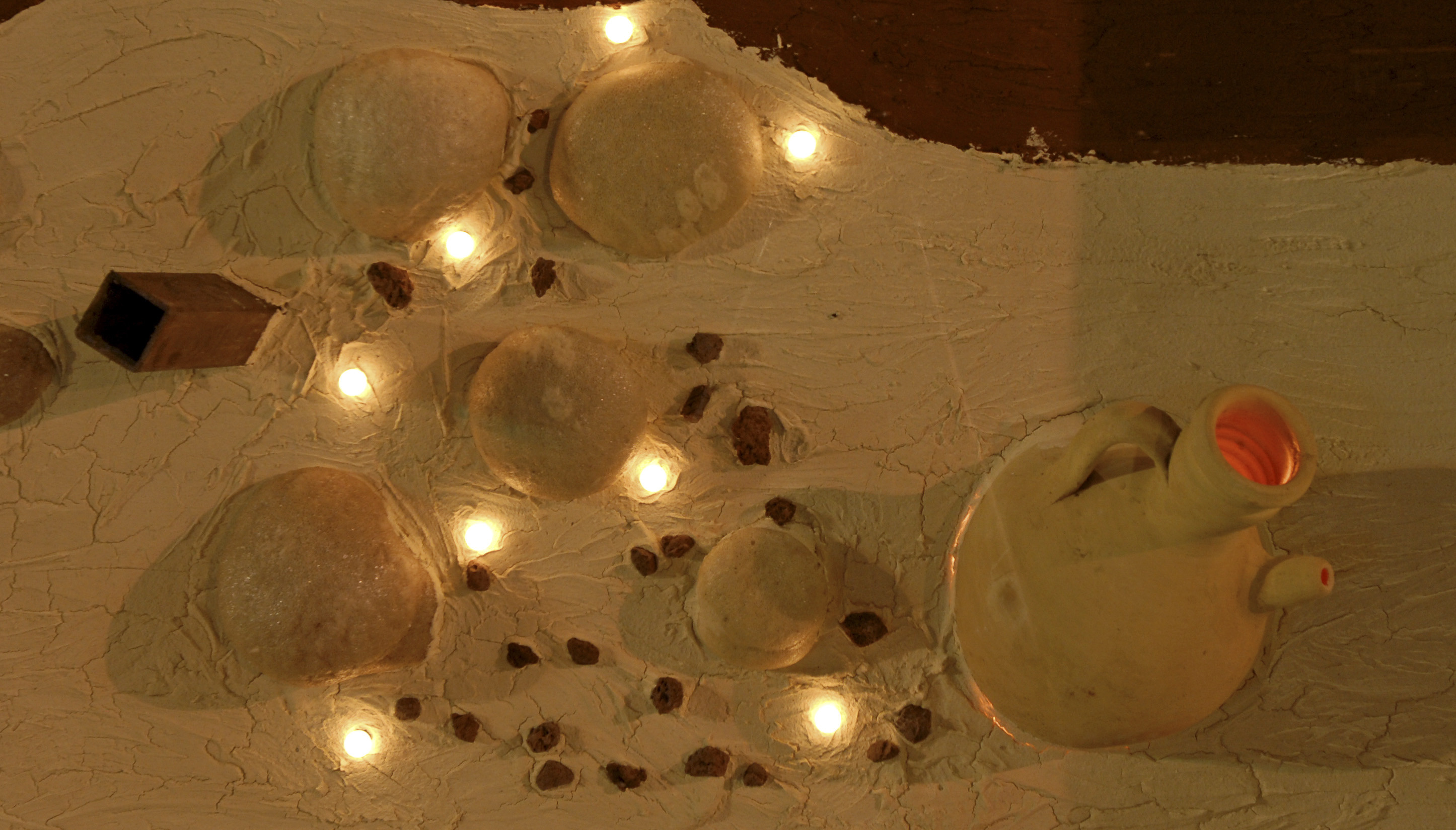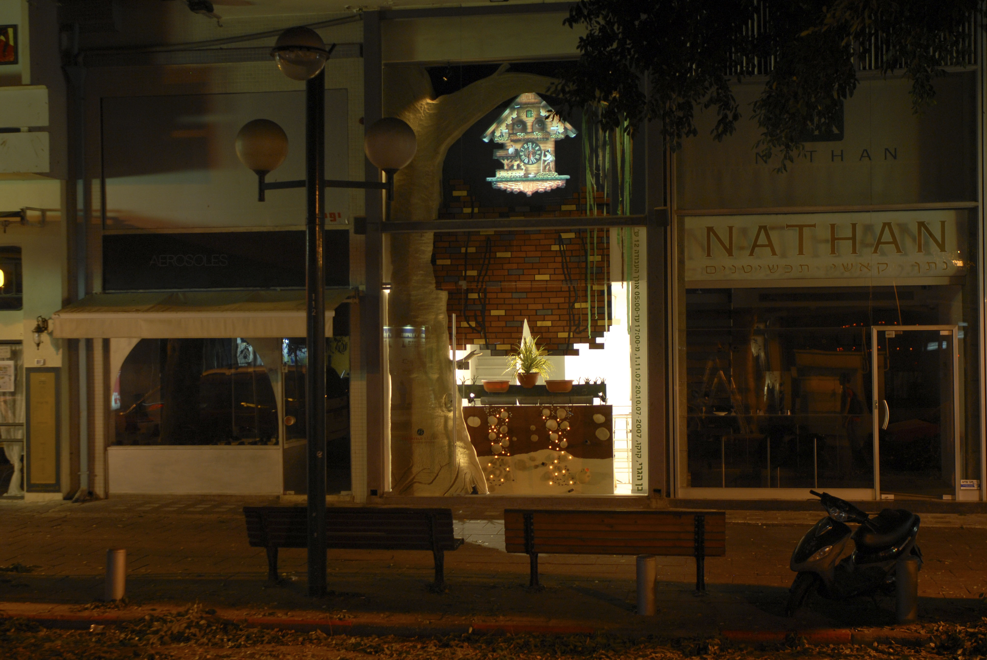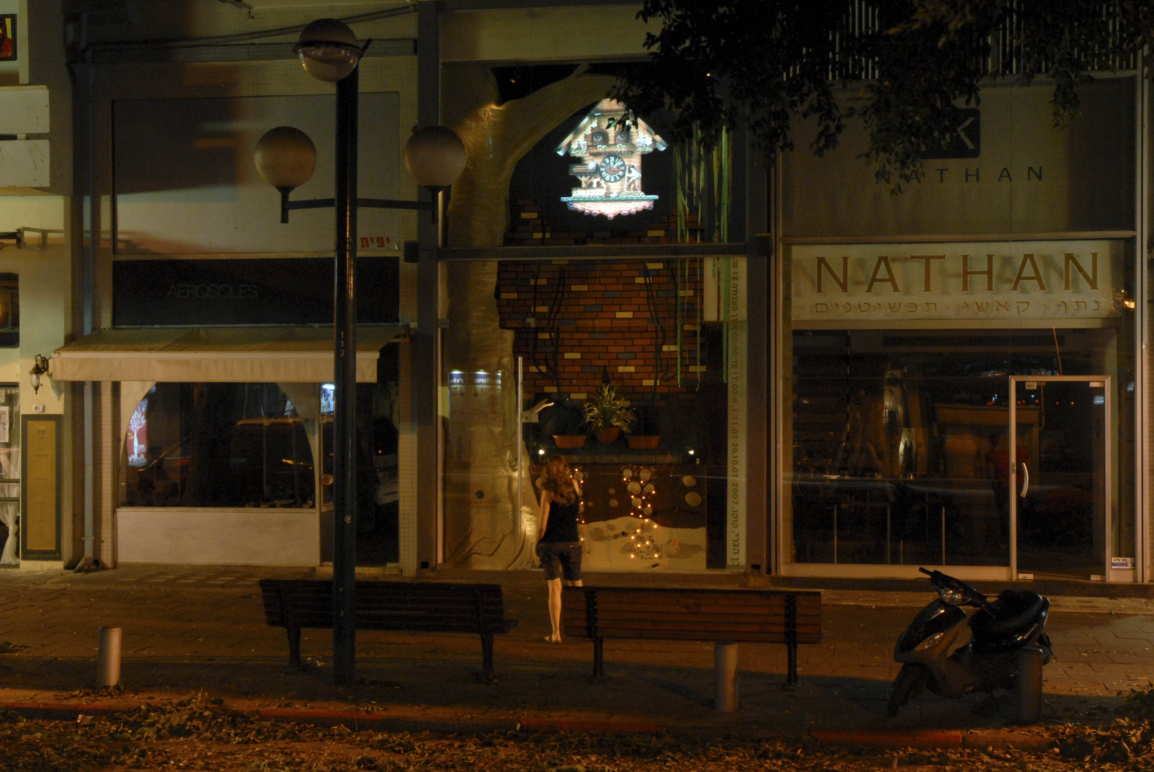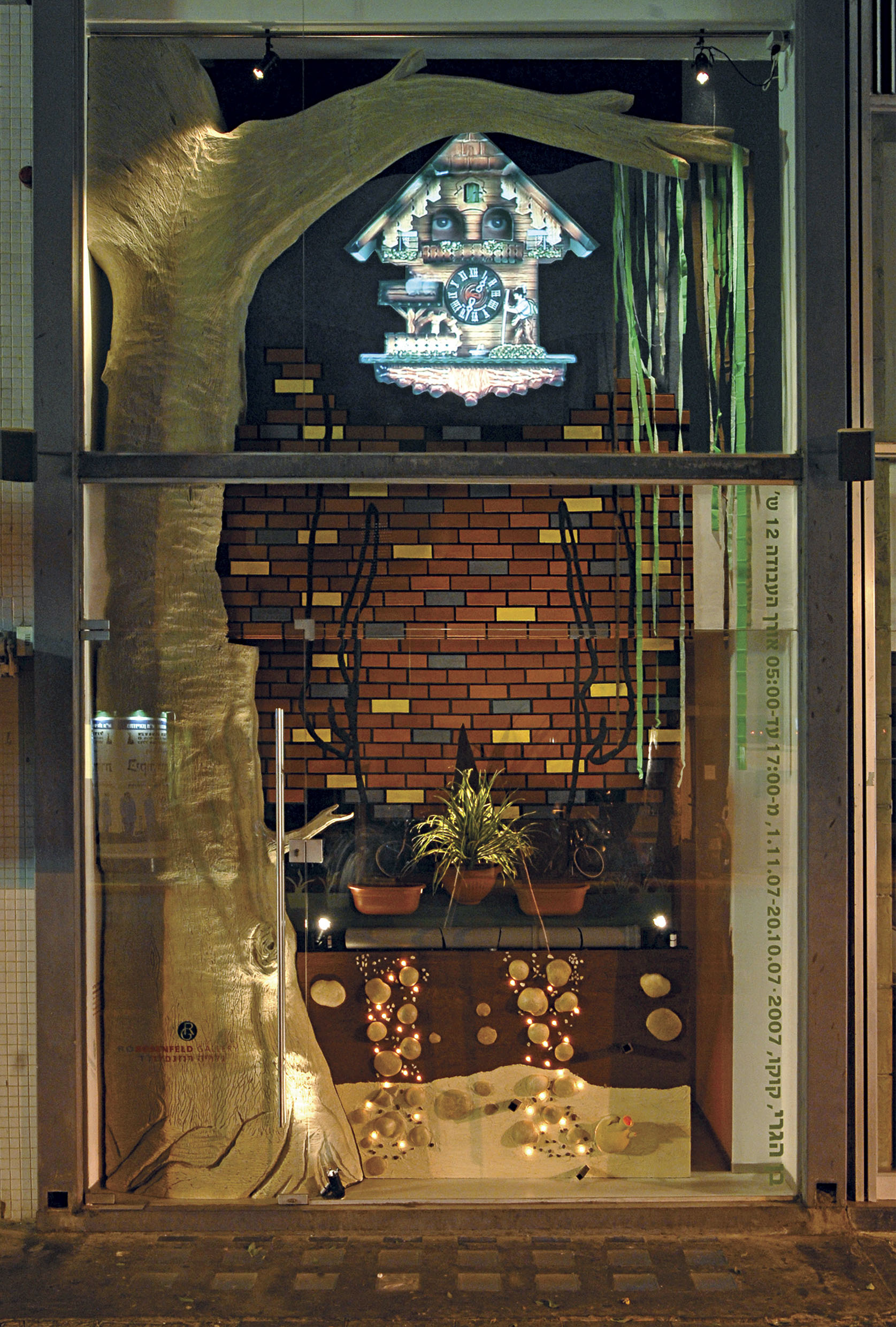 Conceived for the two-story window of Rosenfeld Gallery in Tel Aviv, the video sculpture occupied and blocked the gallery’s entrance. The twelve-hour video sequence, synchronized with real time and projected from sunset to sunrise, features a cuckoo clock animated by human eyes that gaze outward. At thirty-minute intervals, a recorded “cuckoo” call resounds and a bird emerges.
