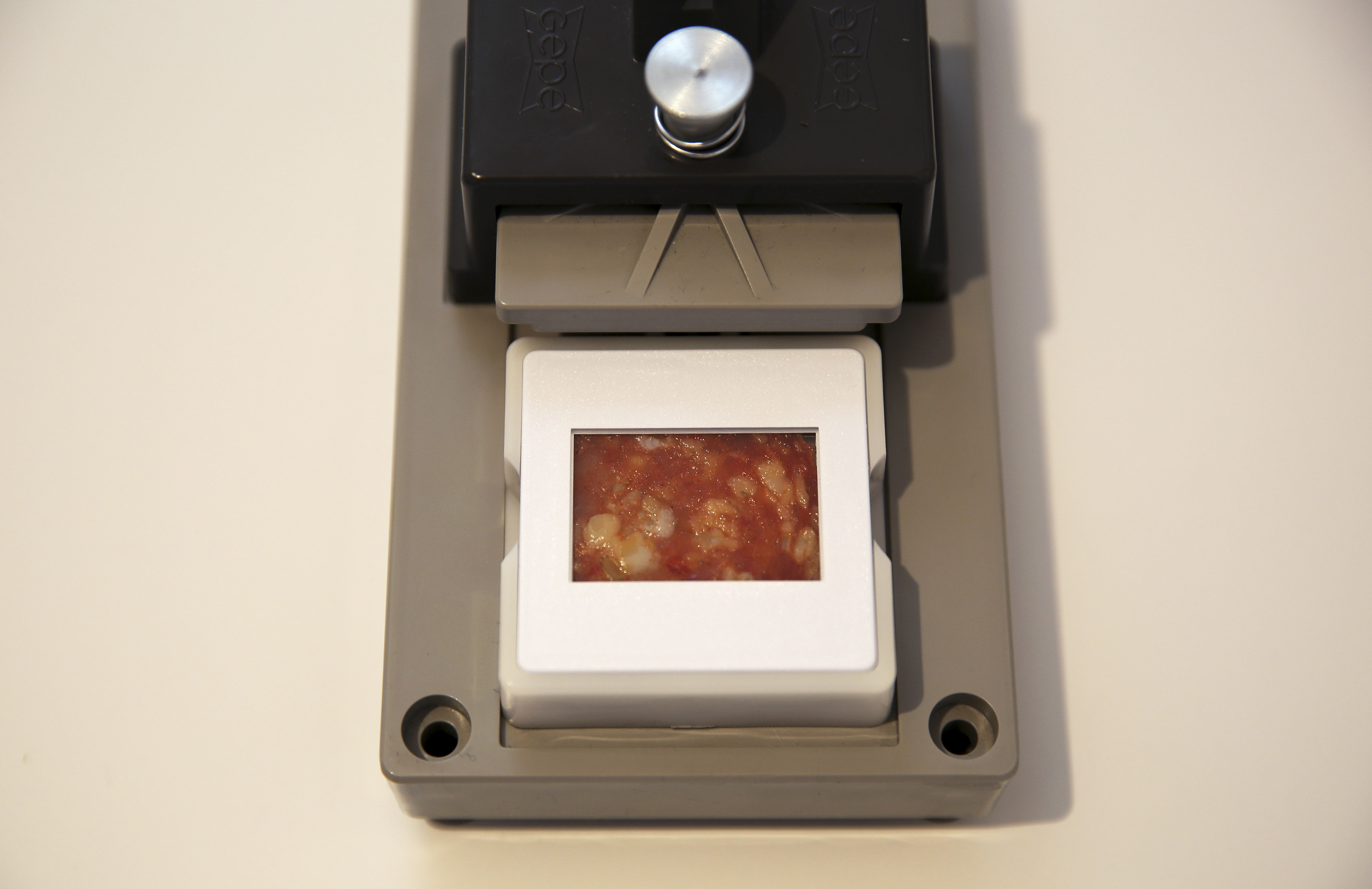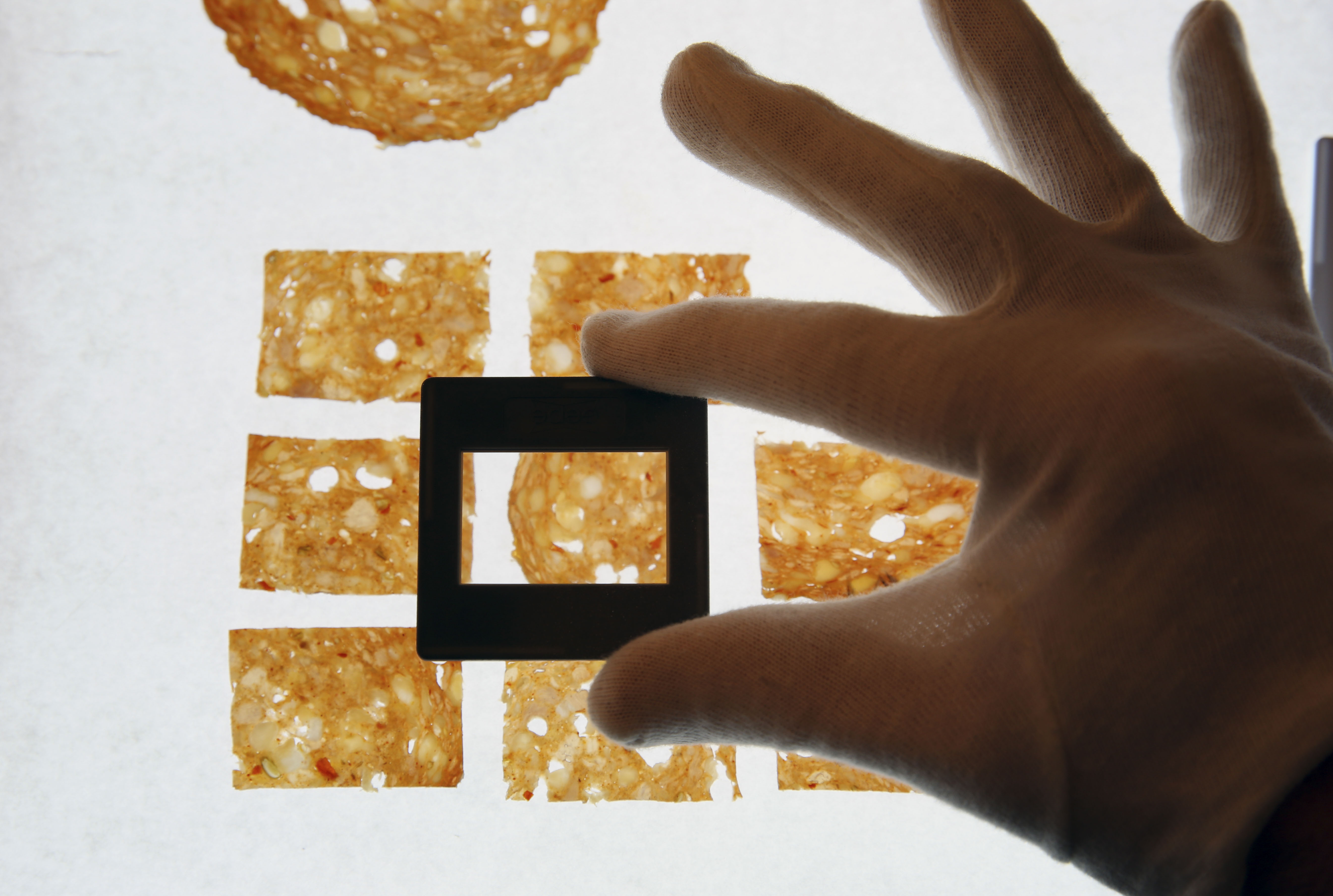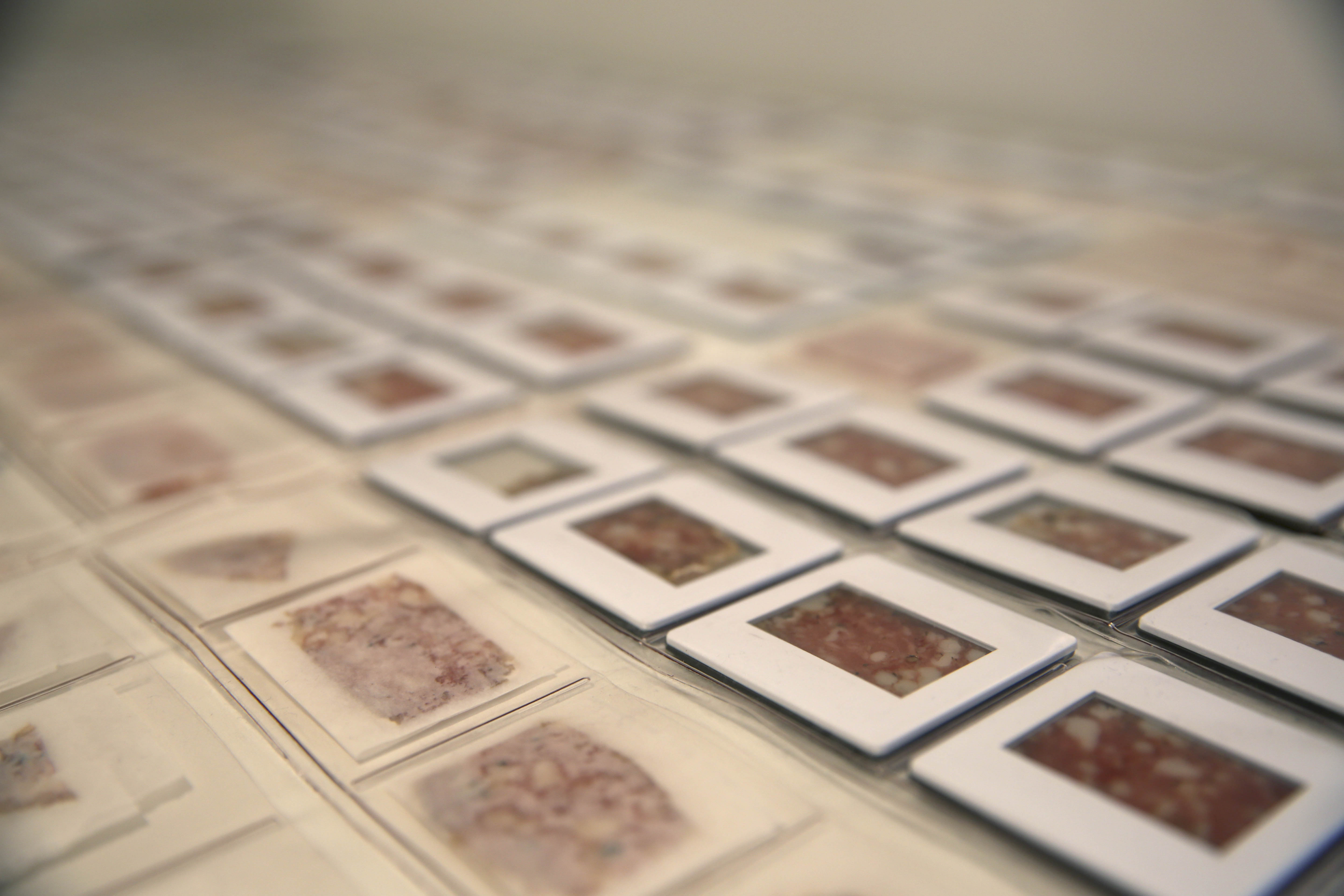 Salami Tactics is a subversive strategy for creating division and removing opposition in order to dominate a political landscape piece by piece, slice by slice. Mechanical precision is required to produce impossibly thin, nearly imperceptible cuts. The 35mm slide projection contains thin slices of Soppressata and other salami that come alive when illuminated by the projector lamp.