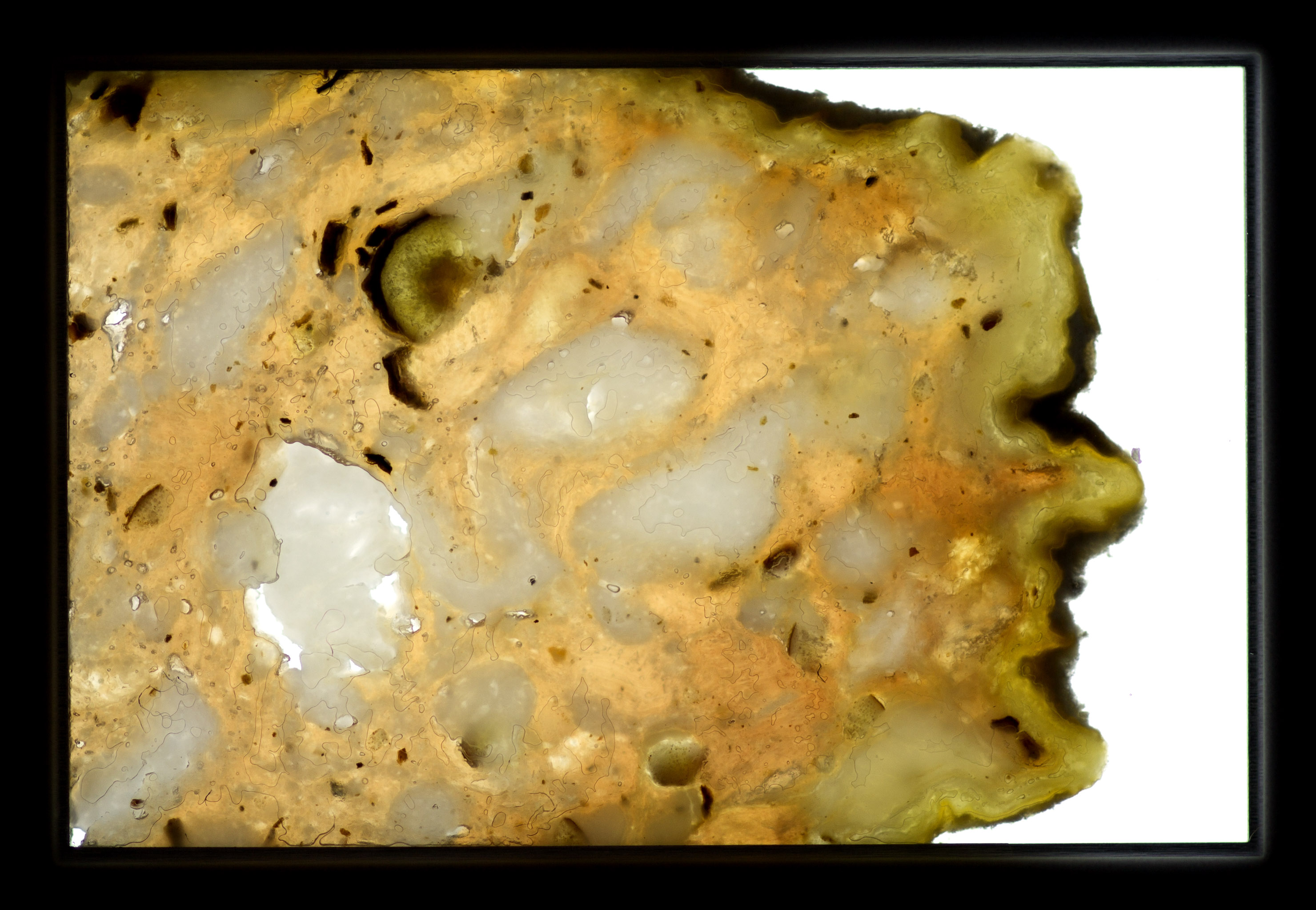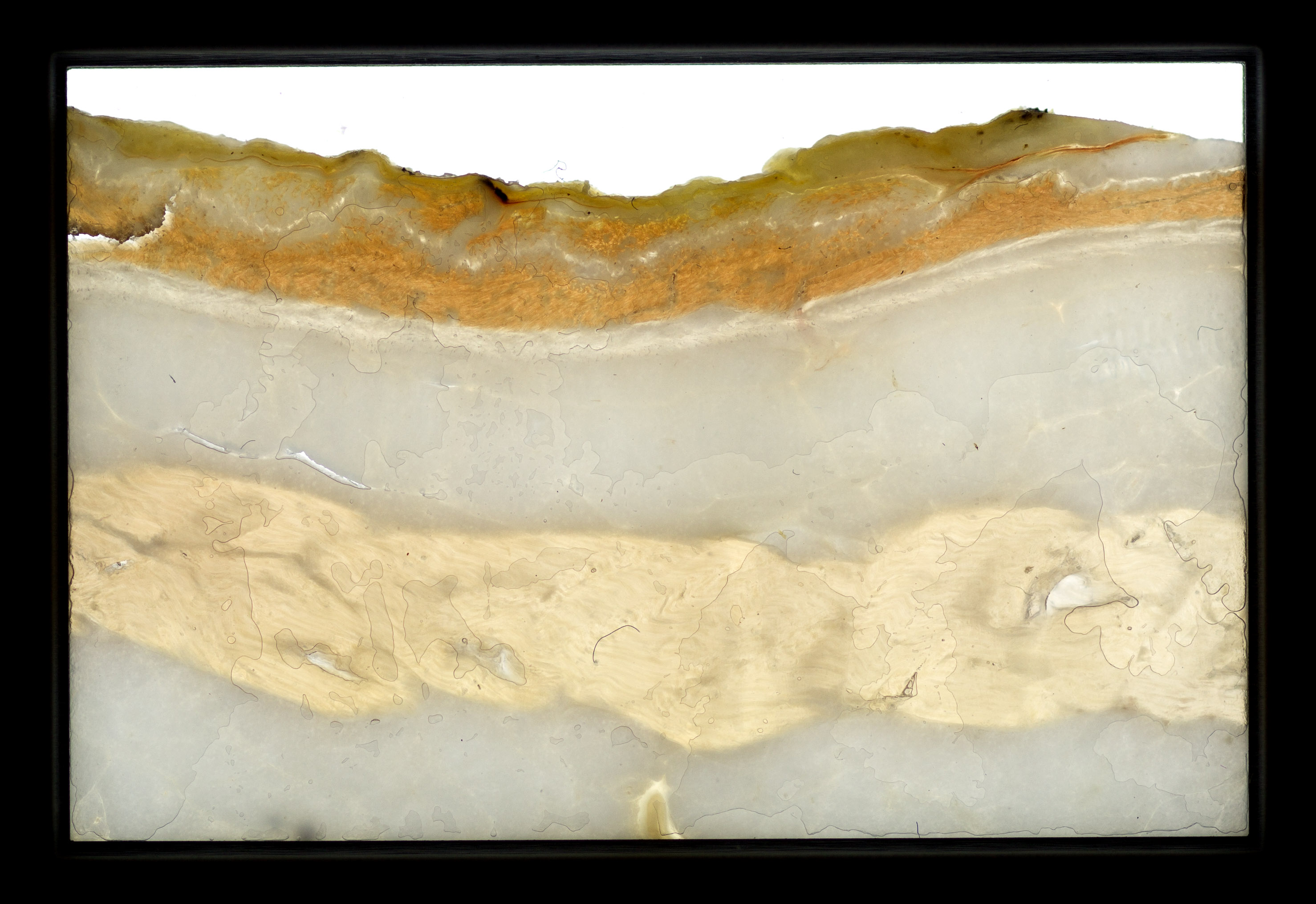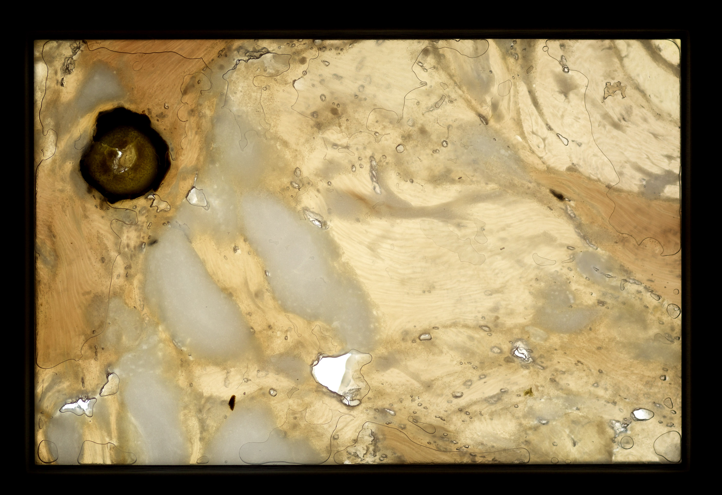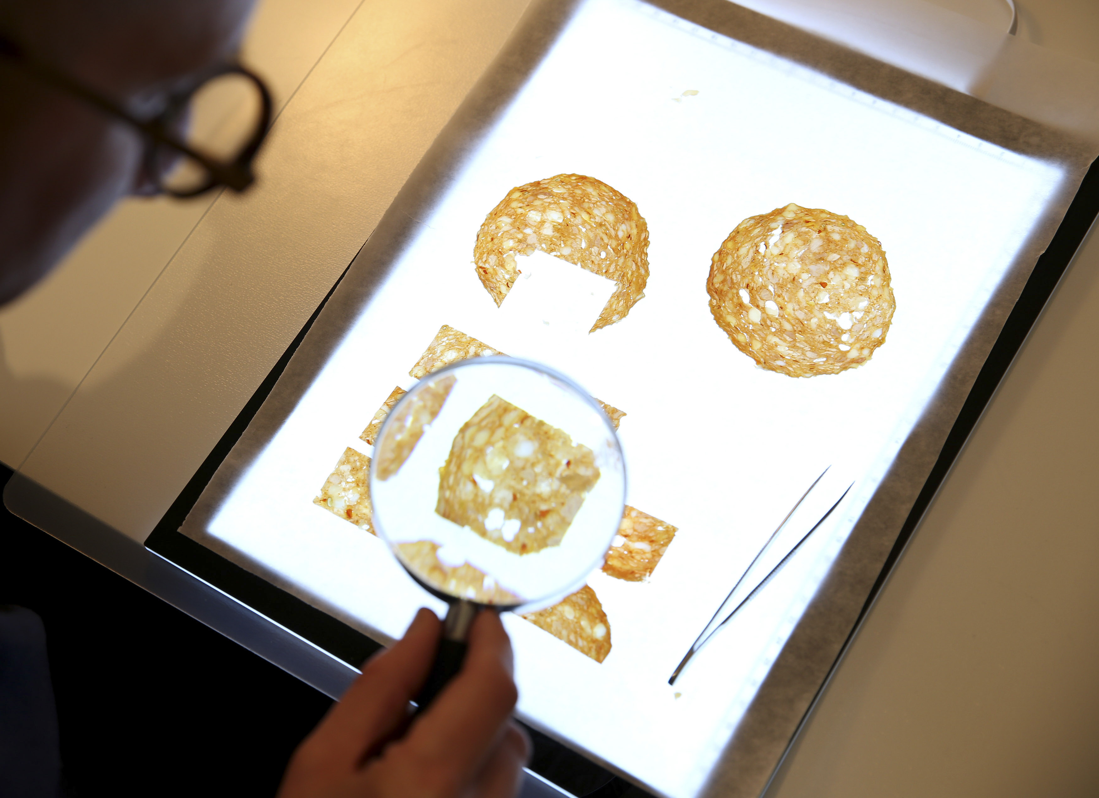 Salami Tactics is a subversive strategy for creating division and removing opposition in order to dominate a political landscape piece by piece, slice by slice. Mechanical precision is required to produce impossibly thin, nearly imperceptible cuts. The 35mm slide projection contains thin slices of Soppressata and other salami that come alive when illuminated by the projector lamp.
