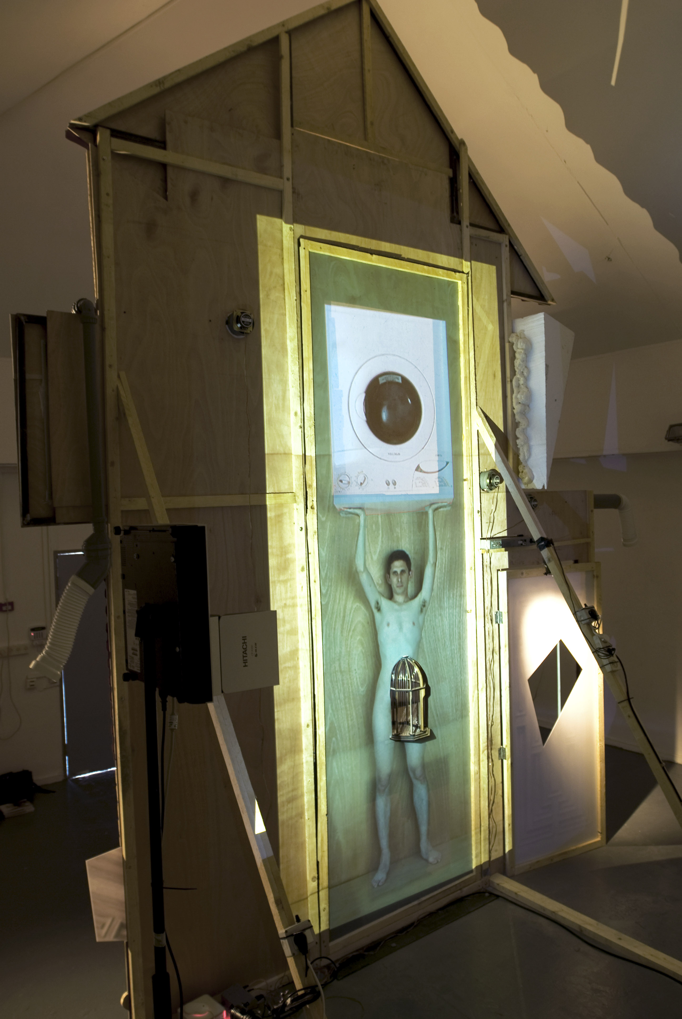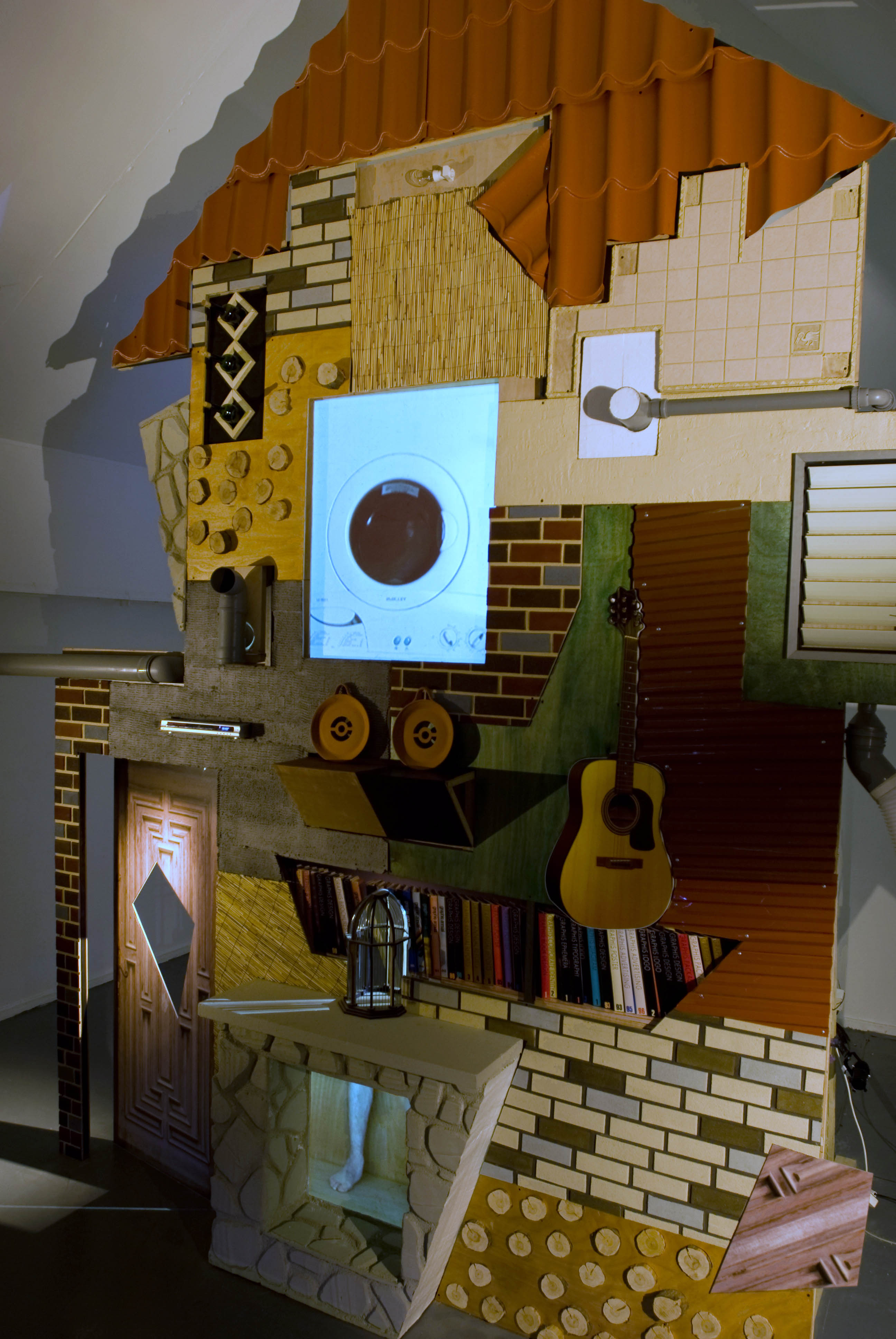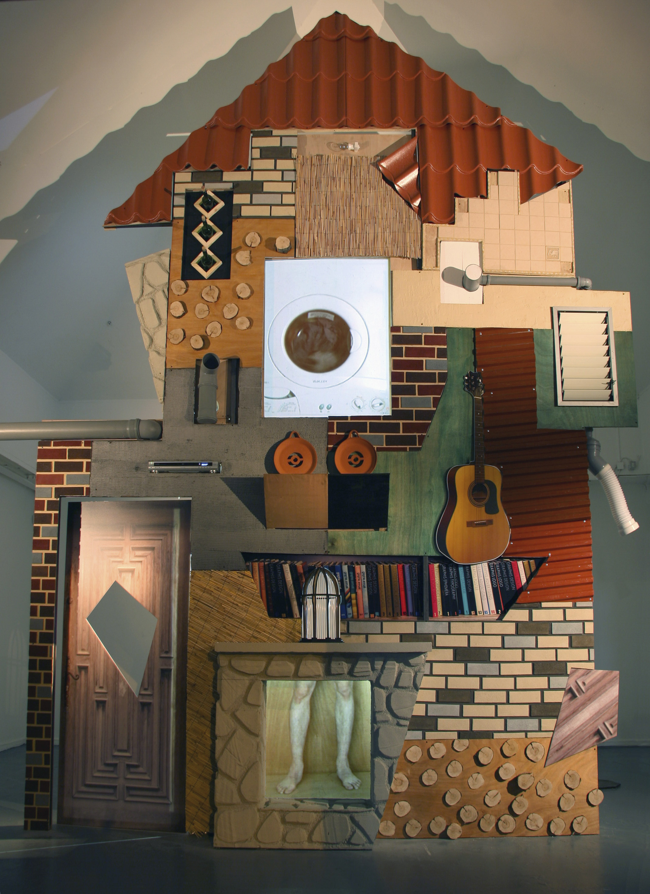 This work comprises an assemblage of a cubist-style house presented as a two-sided video installation. The front side features fragmented depictions of body parts and domestic objects. On the reverse, viewers discover that the entire structure is animated by a video showing a naked figure holding a washing machine. The video runs for 69 minutes—the full duration of a washing cycle. In the projection onto the sculpture, a birdcage is positioned near the figure’s pubic area, its opening allowing the image to vanish in the genital parts.