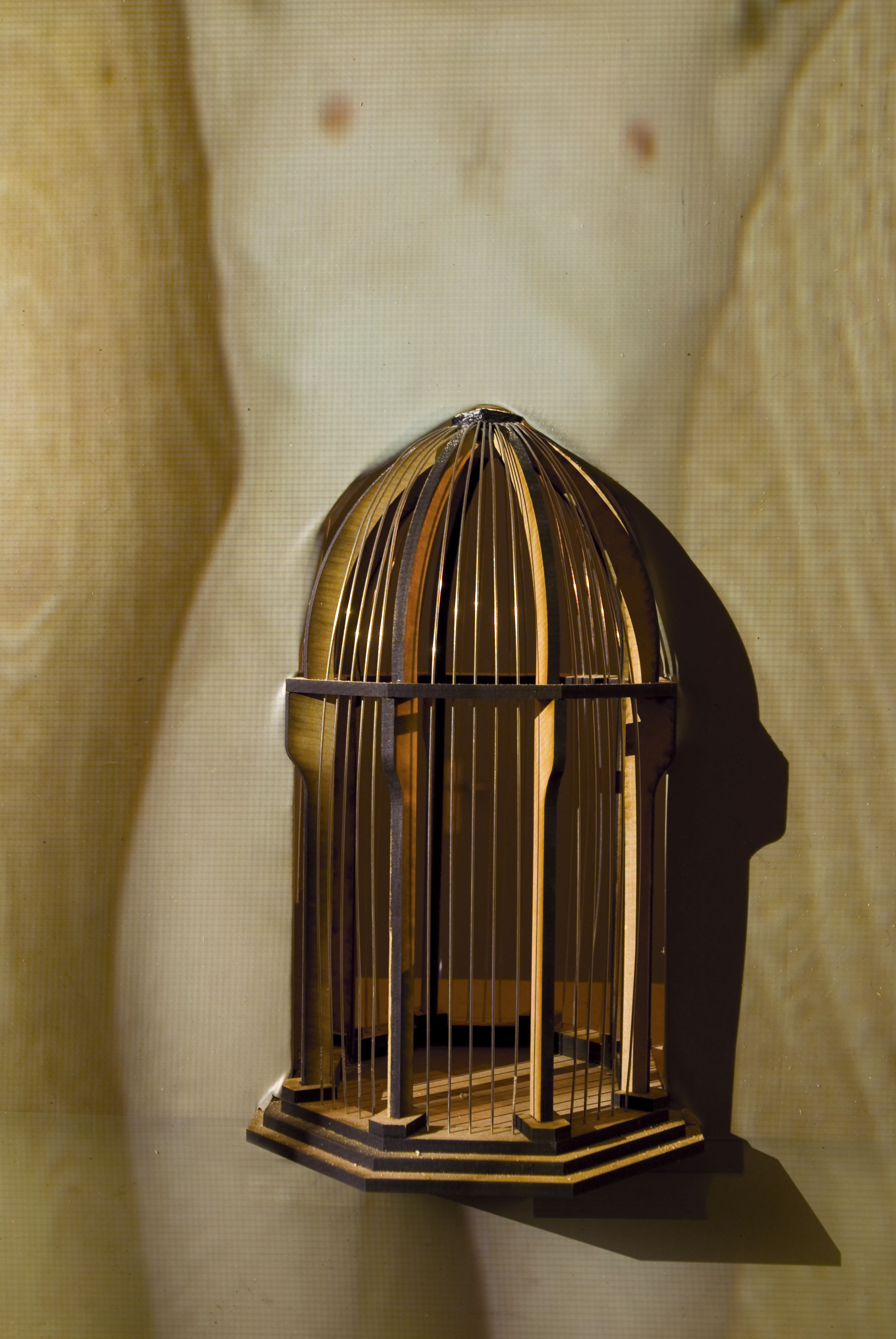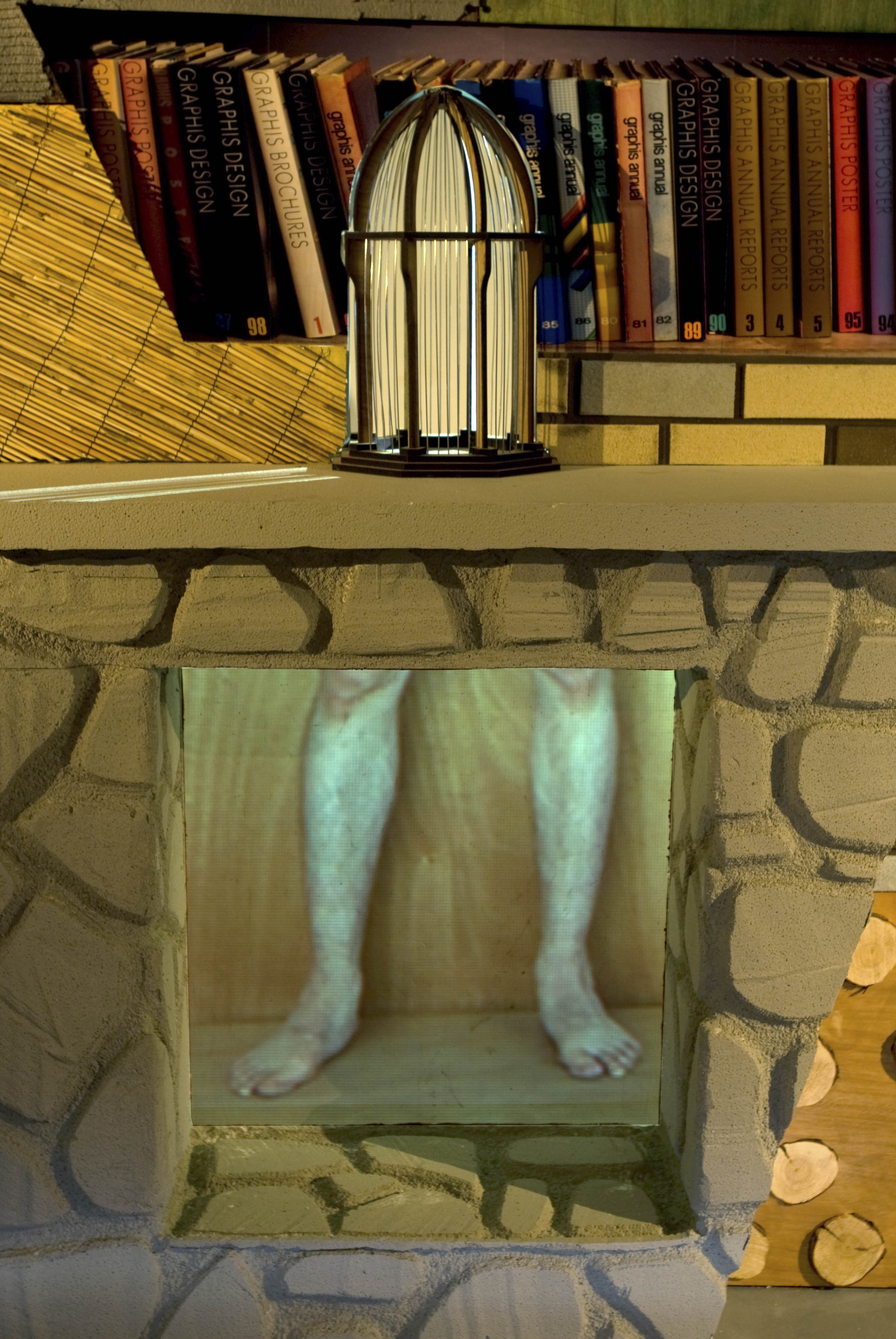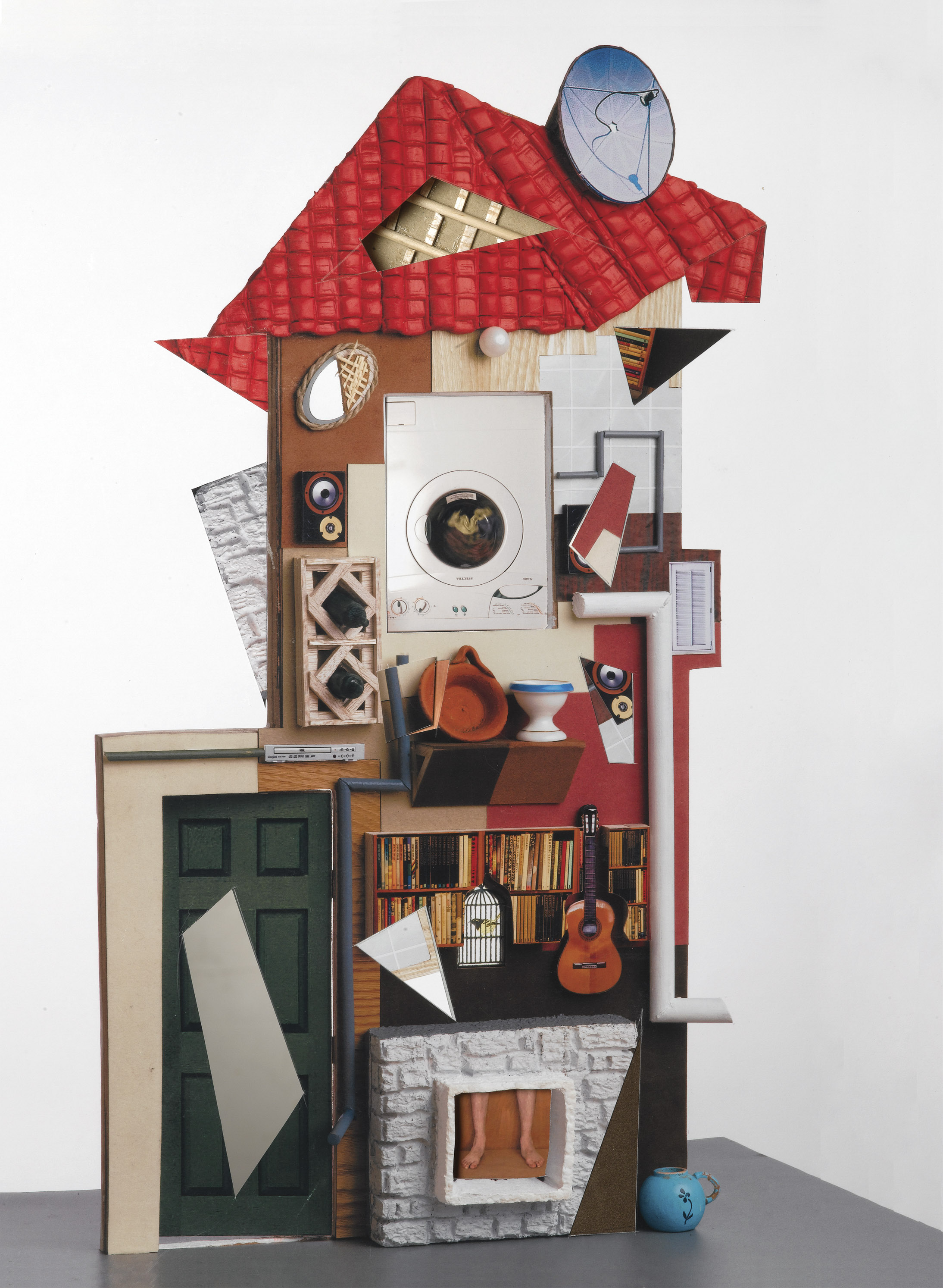 This work comprises an assemblage of a cubist-style house presented as a two-sided video installation. The front side features fragmented depictions of body parts and domestic objects. On the reverse, viewers discover that the entire structure is animated by a video showing a naked figure holding a washing machine. The video runs for 69 minutes—the full duration of a washing cycle. In the projection onto the sculpture, a birdcage is positioned near the figure’s pubic area, its opening allowing the image to vanish in the genital parts.