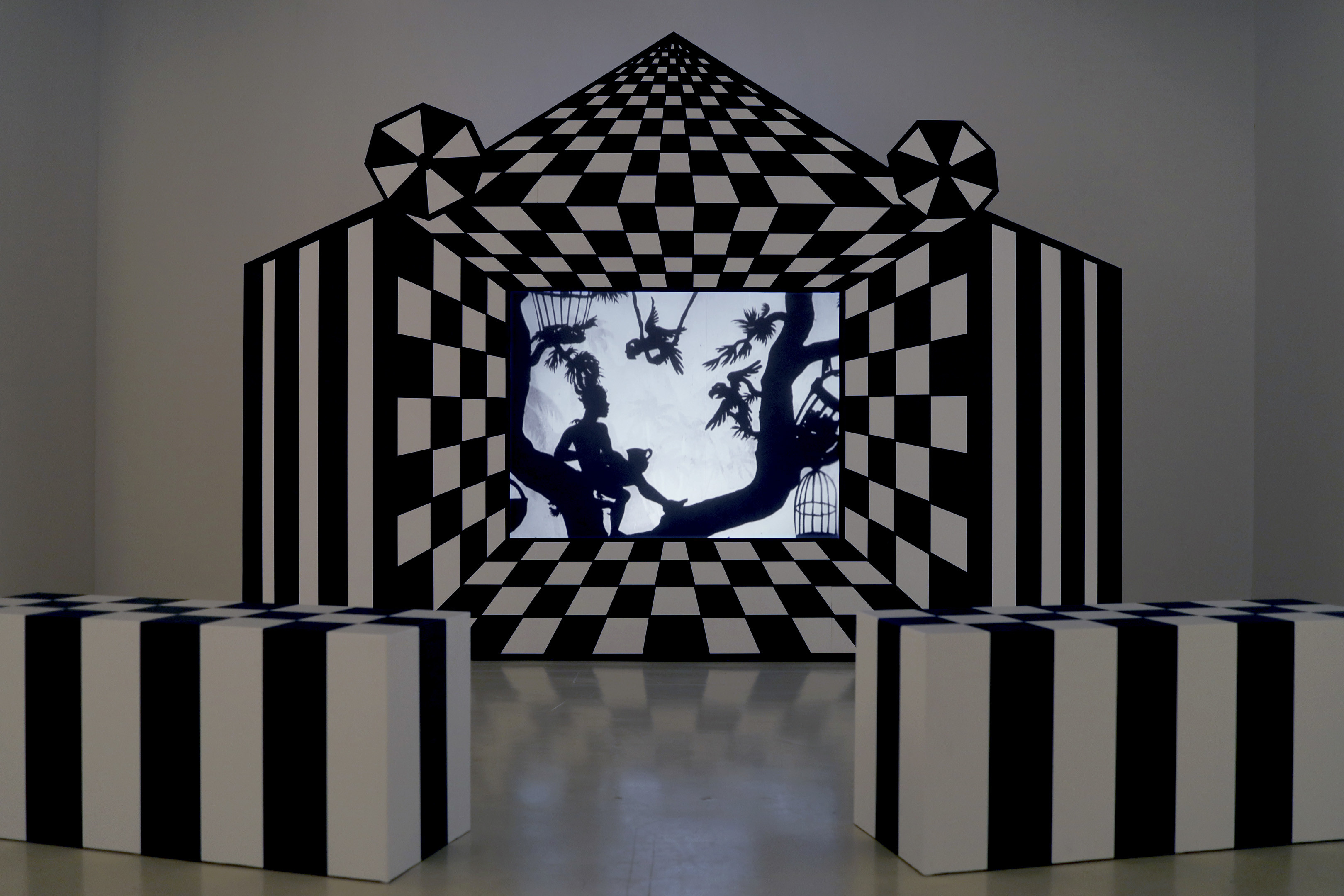 Lotte Reiniger’s (1899-1981) silhouette film Papageno (1935) is projected onto a “Modern Theater” installation conceived for On Point exhibition, and is derived from a drawing made by Reiniger for a modern shadow theater structure, but was never realized.