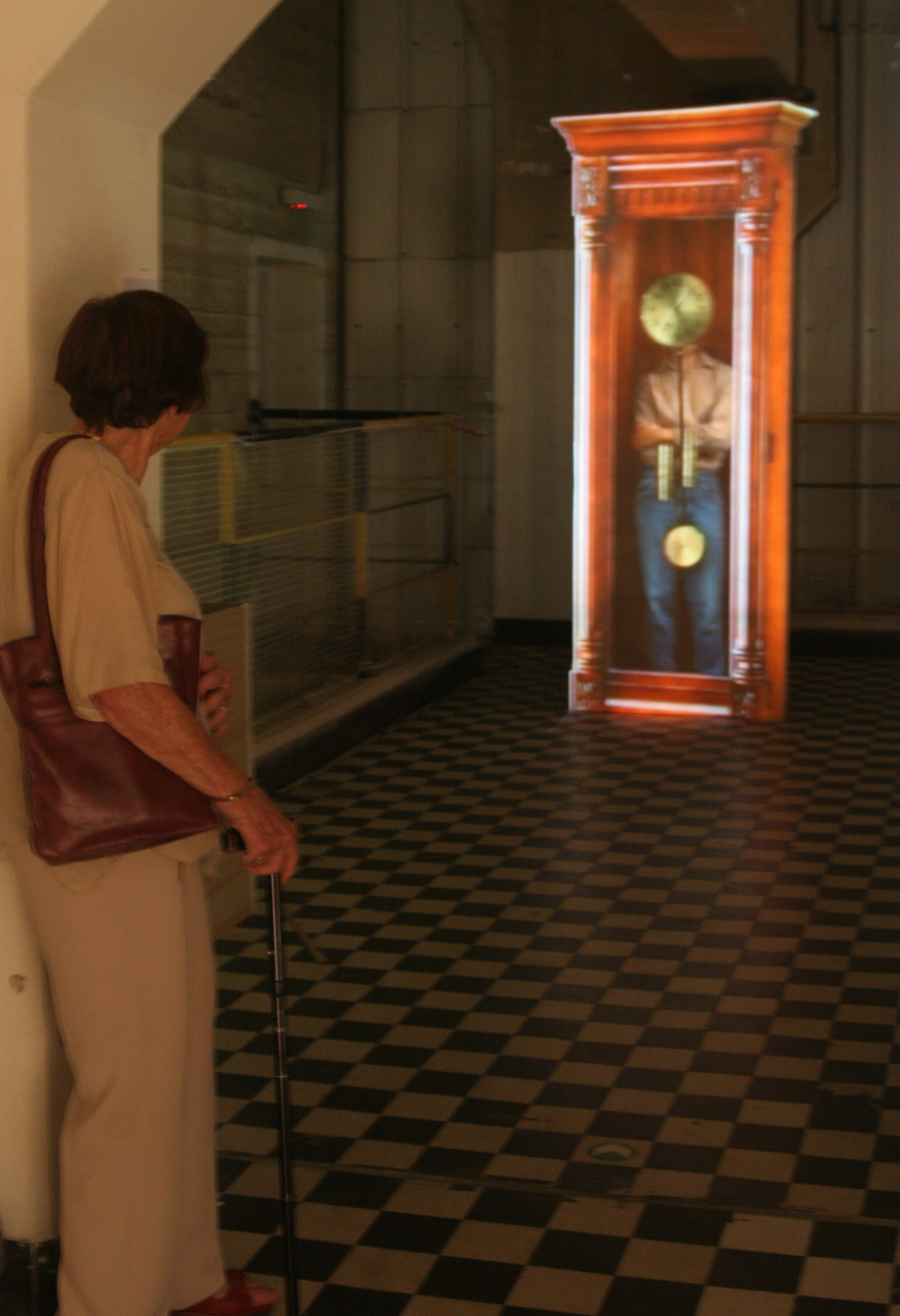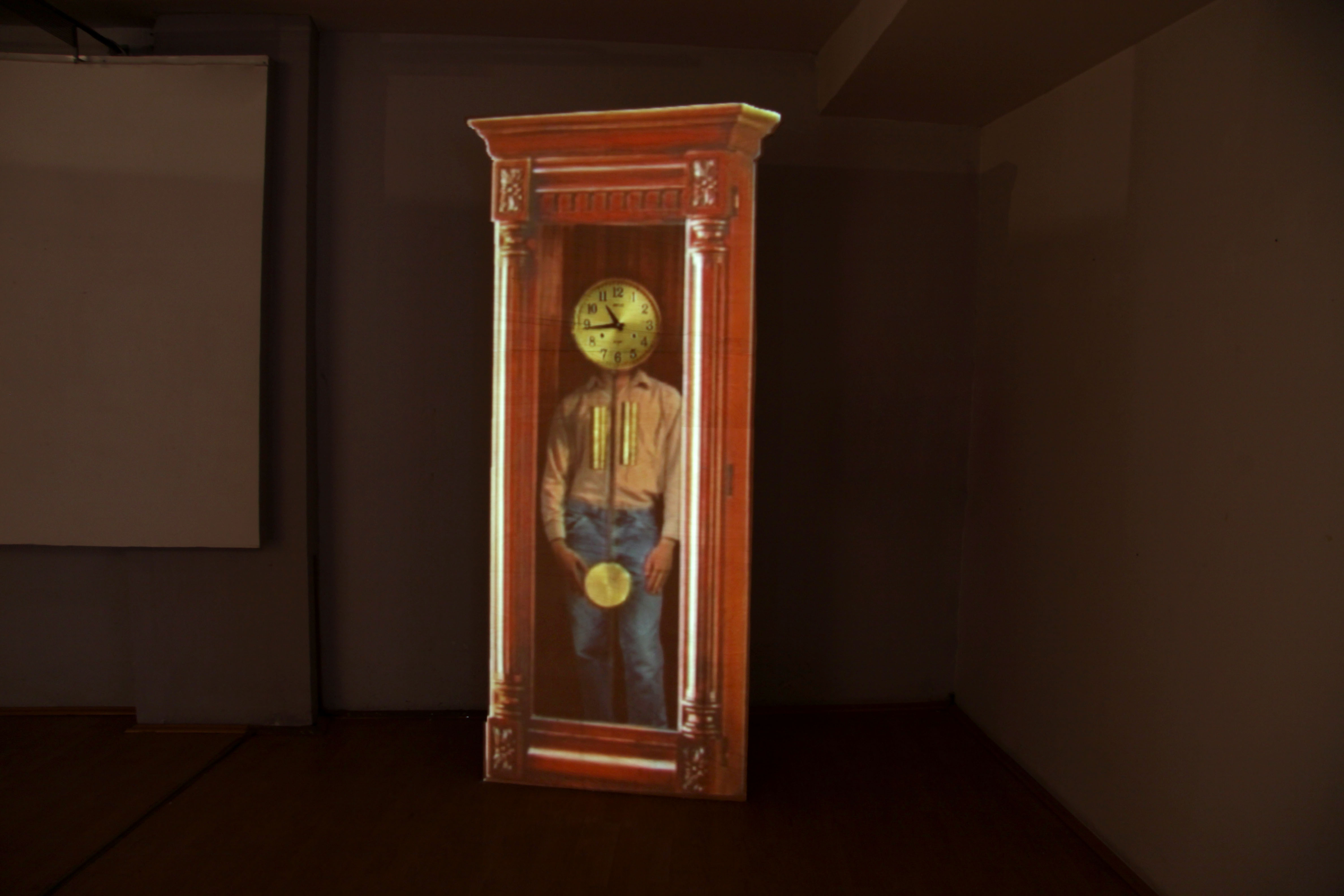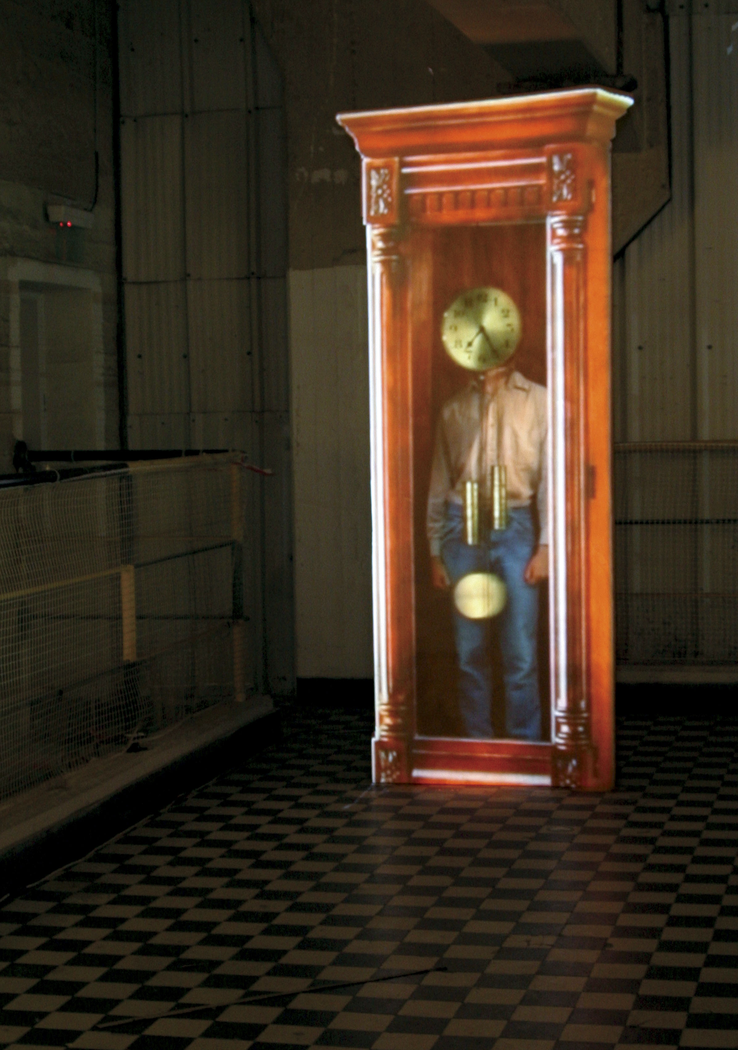 A video that is both a functioning clock and a sculpture. An elongated frame scaled to life-size and projected on a box, features a pendulum clock with a figure (the artist) inside. The dials disk conceals his face, and the pendulum sways from side to side.